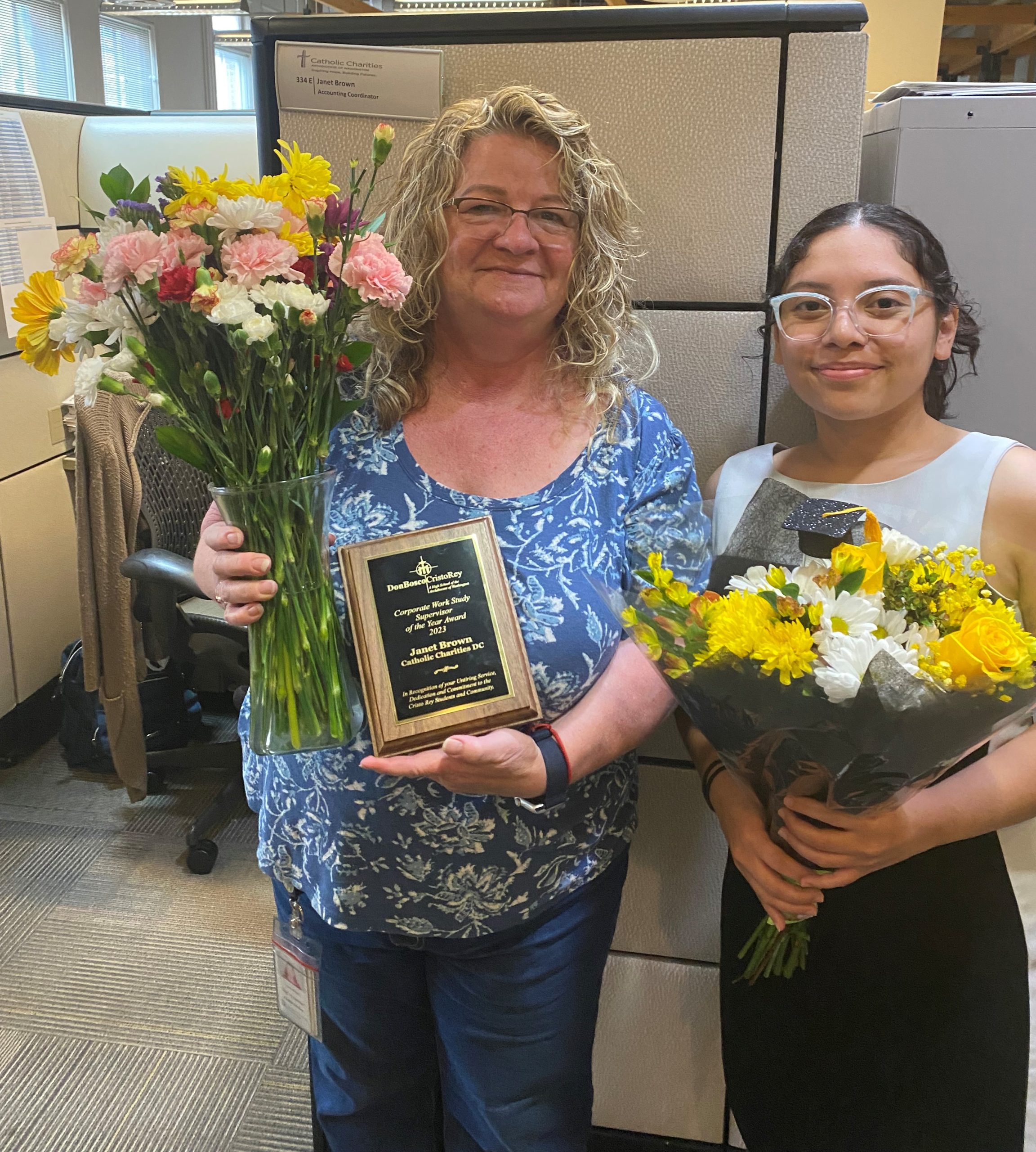 Janet Brown has worked with interns from Don Bosco Cristo Rey High School for eight years in her job as finance account coordinator at Catholic Charities. For her exceptional support of interns, she recently was honored with the corporate supervisor of the year award from the high school.
