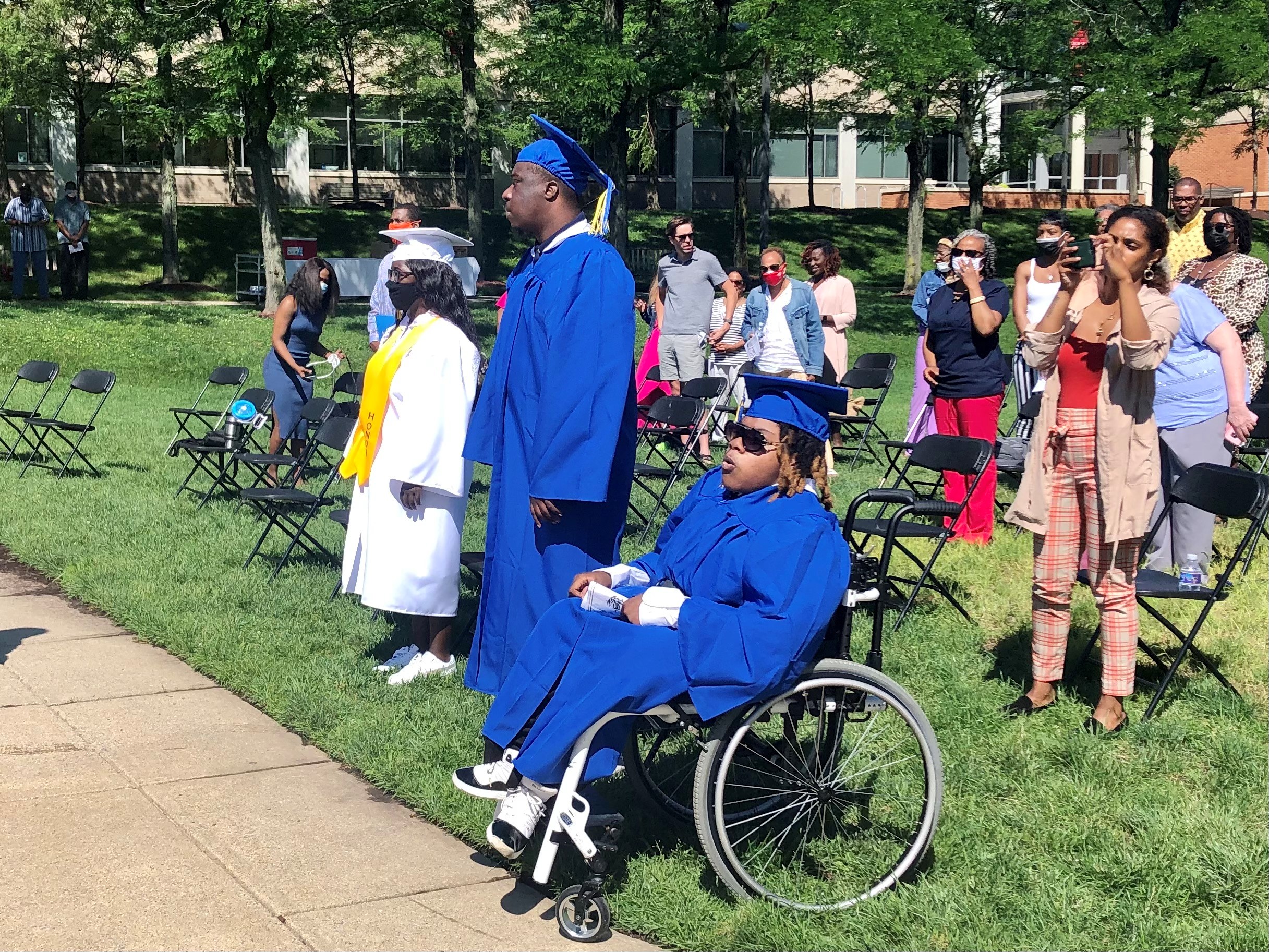 The graduation ceremony, held outside on the grounds of The Catholic University of America, began with words from Vice Principal Marcus Johnson, Principal Dr. Cheryll James and Catholic Charities CEO Father John Enzler.