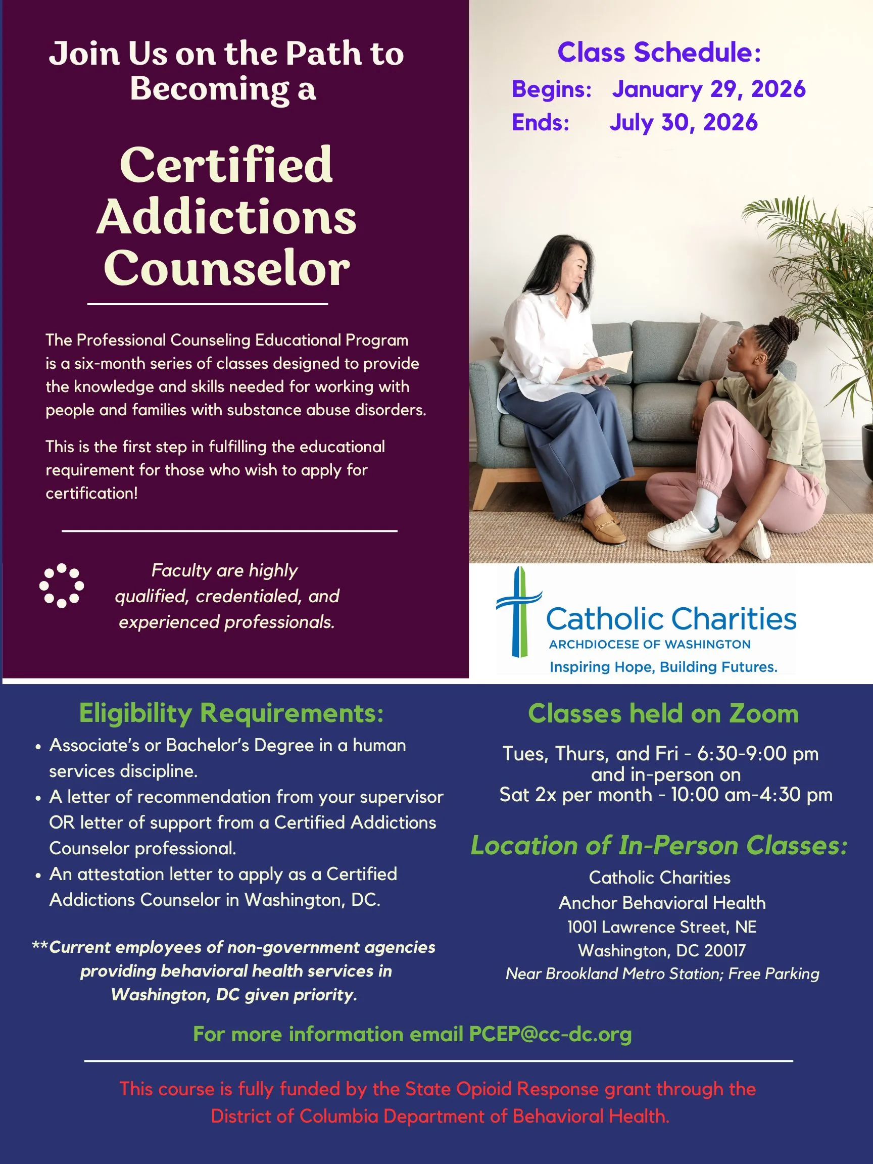 This six-month series of classes partially fulfills the educational requirement for certification as an addiction counselor through the DC Department of Health. Classes meet recertification requirements for addiction counselors and others in human service fields. Professionals in other fields may take courses to increase their academic and professional credentials in substance abuse counseling.