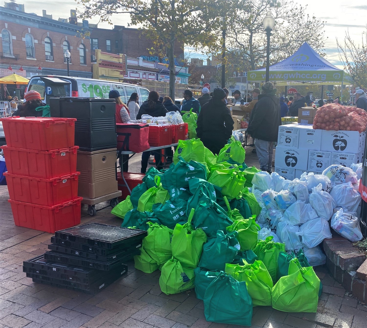 The Spanish Catholic Center food pantry in Northwest D.C. was among the first locations to distribute Thanksgiving food, when it served 300 families on Nov. 16. The distribution commenced at 10 a.m., but families and individuals lined up for blocks across from Lamont Plaza hours before volunteers and staff began handing out food.