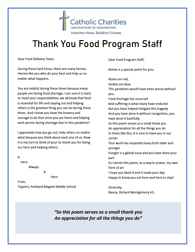 O’Neill and her team also initiated a letter-writing campaign so volunteers and supporters could communicate their gratitude and sense of solidarity to our essential workers.